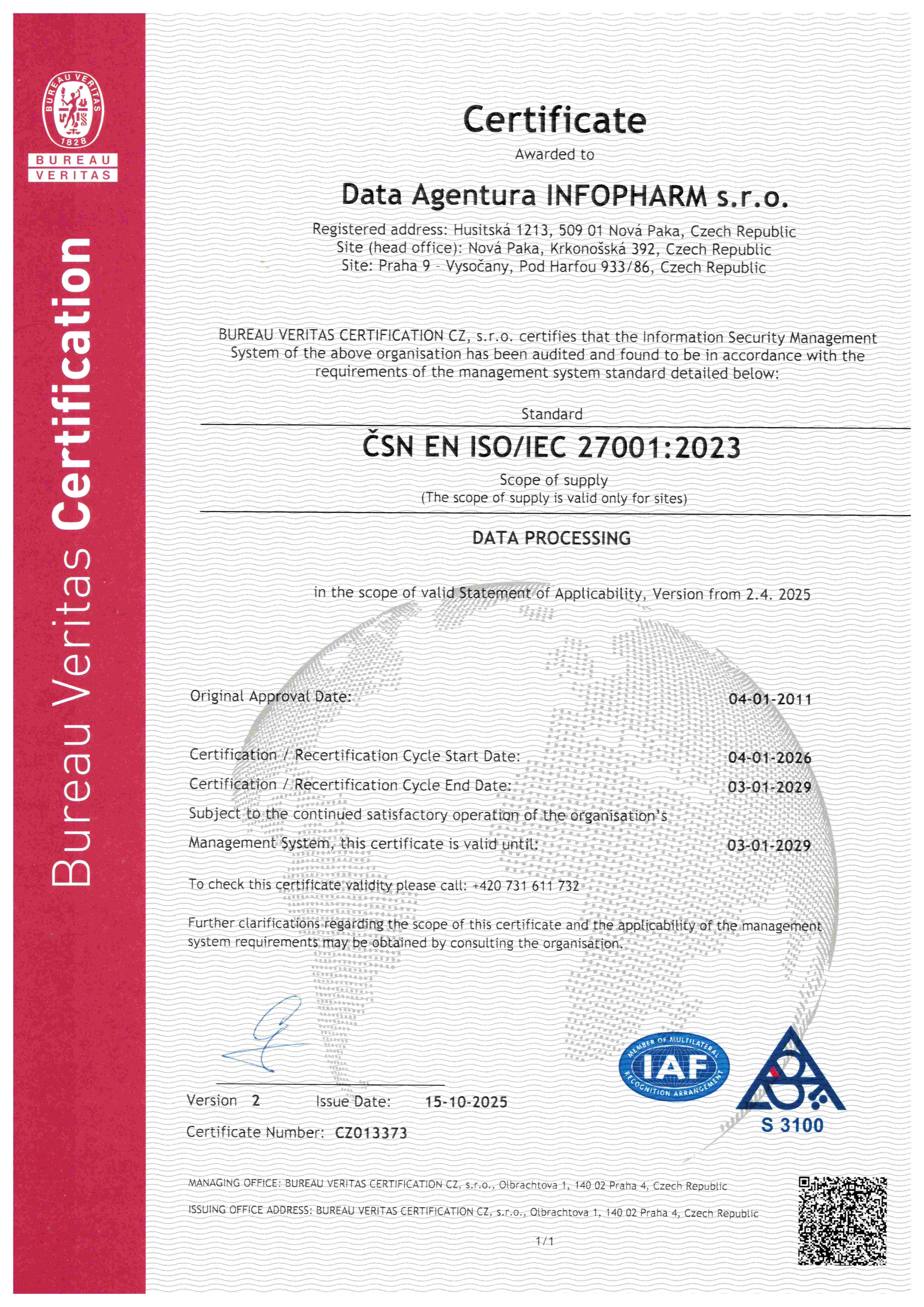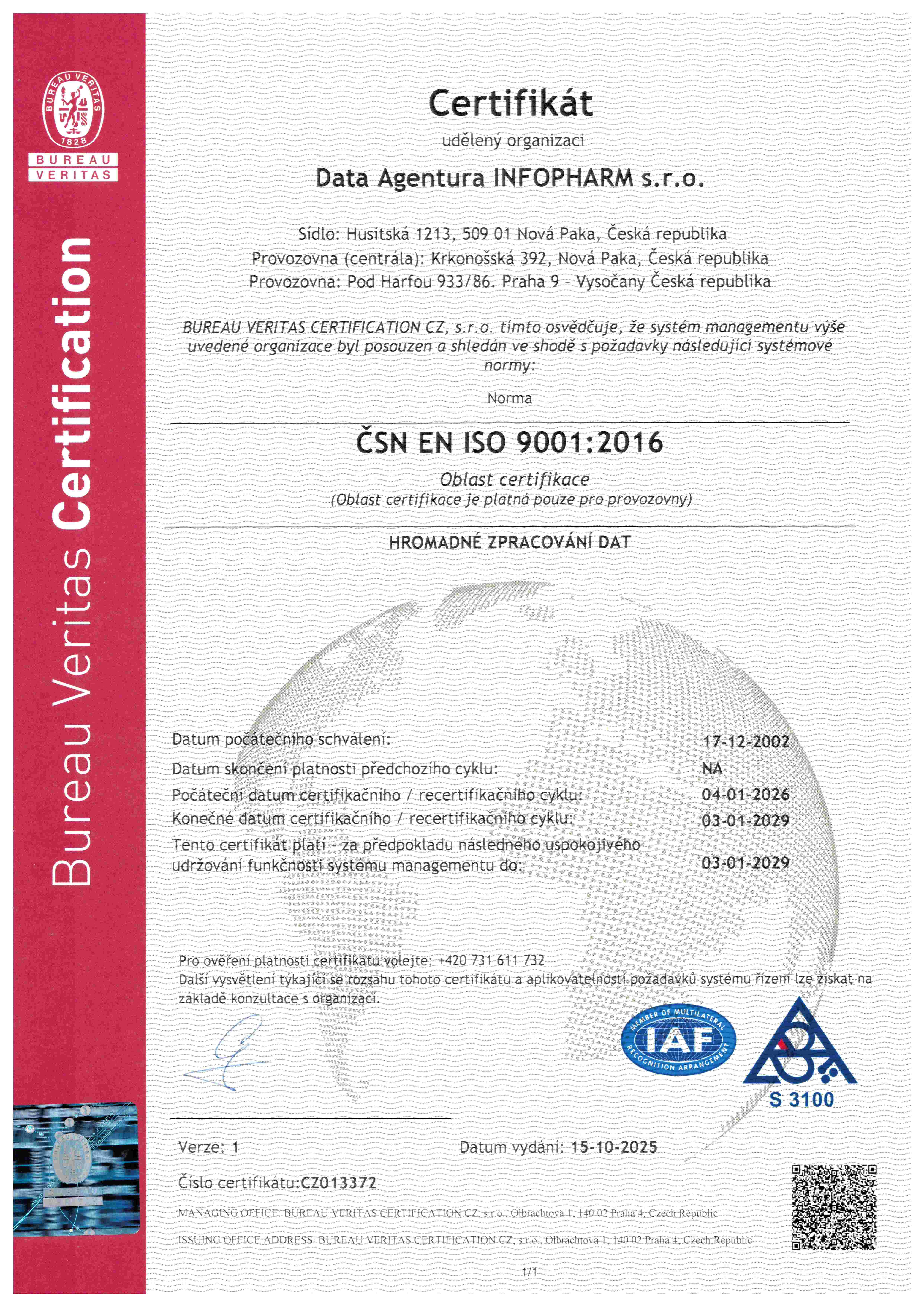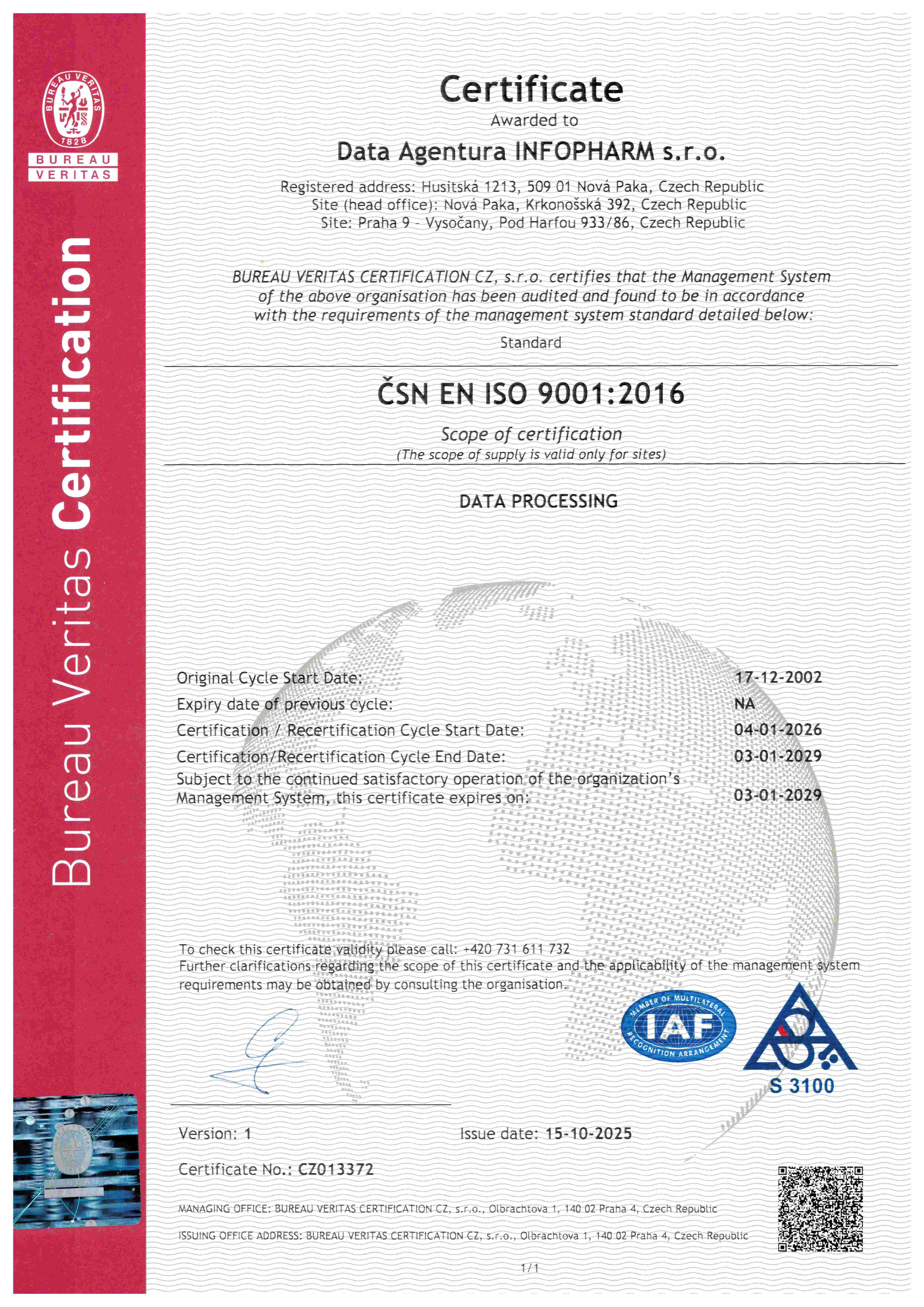 na tuzemském trhu společnost zavedla, udržuje a neustále zlepšuje integrovaný systém řízení kvality (QMS), a bezpečnosti informací (ISMS) ve shodě s mezinárodními standardy ČSN EN ISO 9001:2016 a ČSN ISO/IEC 27001:2023.