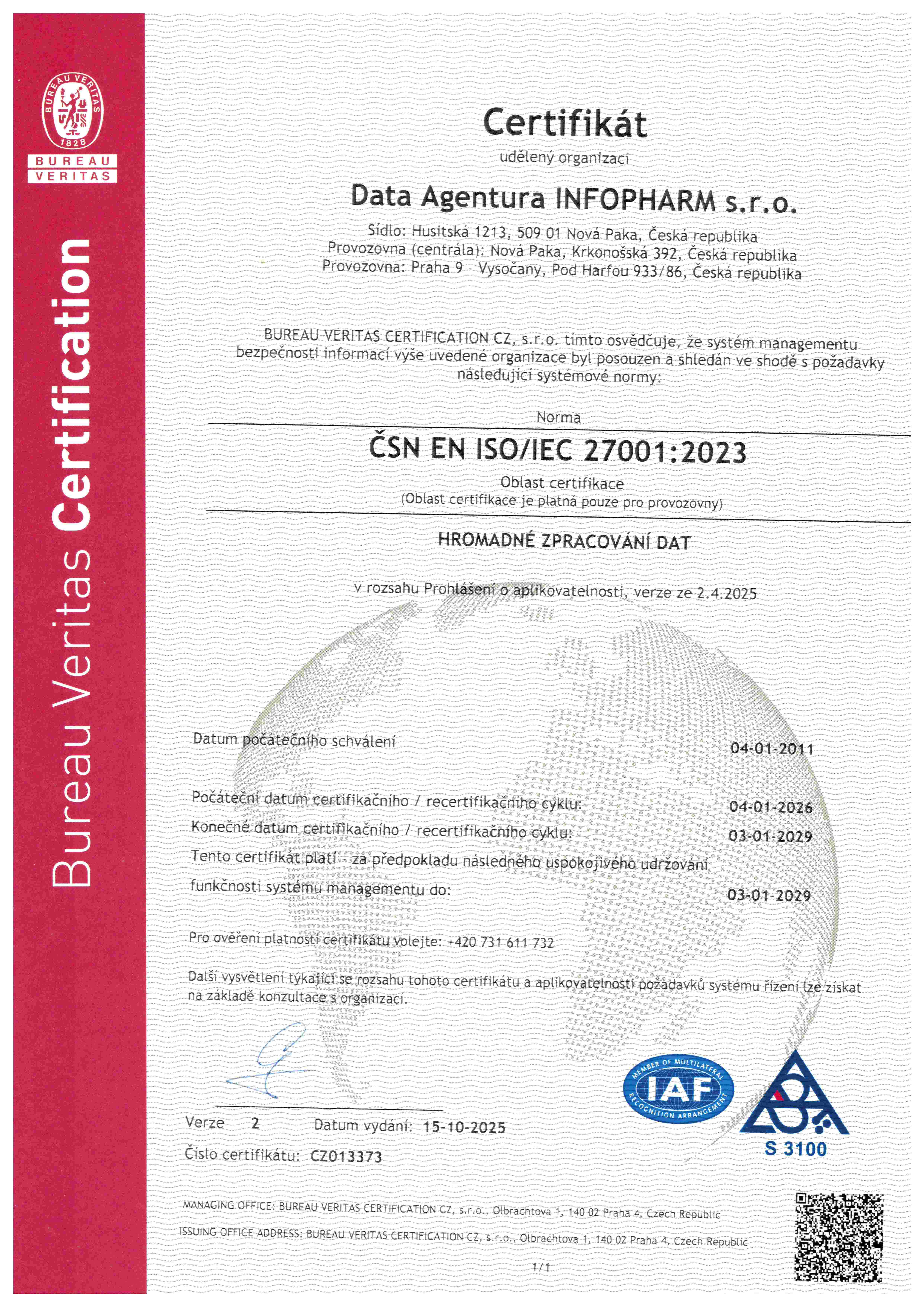na tuzemském trhu společnost zavedla, udržuje a neustále zlepšuje integrovaný systém řízení kvality (QMS), a bezpečnosti informací (ISMS) ve shodě s mezinárodními standardy ČSN EN ISO 9001:2016 a ČSN ISO/IEC 27001:2023.